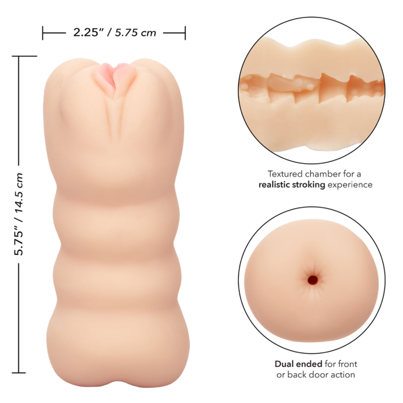 Geben Sie sich der Fantasie Ihres Lebens hin mit dem Masturbator „The Three Way“ von Cheap Thrills. Holen Sie sich das Beste aus beiden Welten mit dem aufregenden Dual-End-Design für das Spielen vor oder hinter der Tür. Eine einzigartig strukturierte Kammer und das ultraweiche, dehnbare Pure Skin-Material umhüllen Ihr Werkzeug mit einem lebensechten Gefühl. Ganz gleich, ob Sie sich zu Hause etwas gönnen oder wohin das Vergnügen Sie auch führt, der kompakte 5,75 x 14,5 cm große ist der verlockende Reisebegleiter, nach dem Sie sich sehnen. Das Premium Pure Skin ist parfümfrei, phthalatfrei und wartungsfrei für wirklich explosive Ergebnisse.