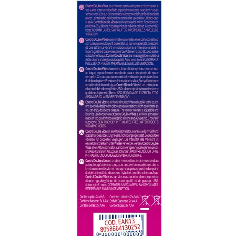 Mit seinen 2 vibrierenden Gliedmaßen genießen Sie doppeltes Vergnügen. Die Intensität des Vibrators ist einstellbar und kann unter Wasser verwendet werden. Control Double Vibes ist ein Intimstimulator aus ABS-Kunststoff und hypoallergenem Silikon höchster Qualität.