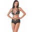 De bh bestaat uit driehoekige cups met dunne, decoratieve bandjes. Naast de standaardbandjes zijn er extra bandjes die langs de halslijn lopen. Deze benadrukken de buste en zorgen ervoor dat de outfit één geheel lijkt. Het slipje heeft ook zwarte bandjes met gouden gespen als sluiting. Ze kruisen rond de taille, waardoor het lichaam optisch slanker oogt en er sexy zandloperfiguurtjes ontstaan. De charmante vleugels aan de zijkanten van het broekje zorgen ervoor dat de heupen voller lijken. De kanten onderkant van het ondergoed bedekt de gehele billen, waardoor het ook dagelijks en onder alle soorten kleding gedragen kan worden.