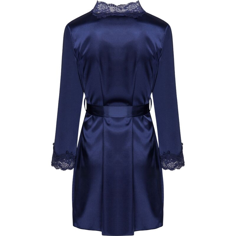 Een uitzonderlijk mooi lingeriesetje van glanzend marineblauw satijn, een badjas met een hemdje dat tot halverwege de dijen komt. De voorkant en de lange mouwen van de jurk, die met een riem in de taille worden vastgebonden, zijn versierd met mooi kant. T-shirt met verstelbare dunne bandjes, versierd met hetzelfde kant op de buste. Inclusief string.