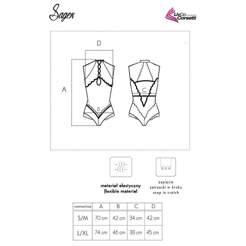 Body Sagen ist ein Angebot für selbstbewusste Frauen, die ihren Sexappeal betonen möchten. Das Kostüm besteht aus Mesh und Spitze, wodurch es transparent ist. Das Modell ist bis zum Hals aufgebaut. Es verfügt über sinnliche Ausschnitte entlang der gesamten Brustbeinlinie und wird mit glänzenden, mit Stoff überzogenen Knöpfen geschlossen. Gleichzeitig lenkt das Abdecken der Brüste die Aufmerksamkeit auf sie. Im unteren Teil bedeckt der Spitzenbody die Hüften, gibt den Po frei und modelliert ihn wirkungsvoll. Ein weiteres charakteristisches Element des Kostüms ist ein großer Ausschnitt auf der Rückseite, der in der Taille mit einem Gürtel abgeschnitten wird.