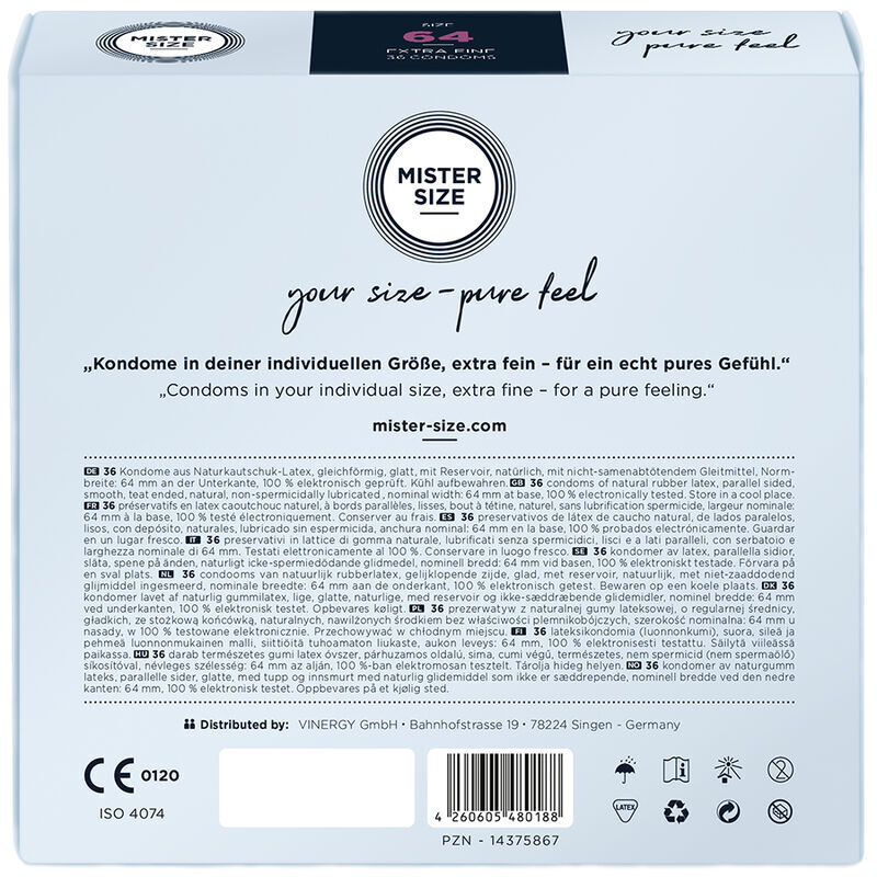 Mit MISTER SIZE 64 hast Du das Kondom, das Dir in jeder Hinsicht ein angenehmes Gefühl verschafft. Zwicken, Kneifen und das Gefühl, Deine Männlichkeit würde erstickt, gehören der Vergangenheit an! Ab sofort beginnt das pure Vergnügen. Kurz vor dem Liebesspiel entsteht durch das leichte Überziehen des Kondoms über Deinen starken und robusten Penis eine wundervolle Vereinigung – eine Vereinigung, die Dir wundervolle Momente sinnlicher Lust bescheren wird. Leichter und perfekter Sitz mit Deiner persönlichen Kondomgröße Egal, was in der Vergangenheit passiert ist, ein Kondom kann und sollte immer perfekt sitzen! Mit Deiner persönlichen Größe umschließt Dein MISTER SIZE Kondom Deinen Penis warm wie eine zweite Haut und ermöglicht ein natürliches Gefühl. Du kannst Dich jetzt entspannen und Dich beim Sex endlich vollkommen fallen lassen.