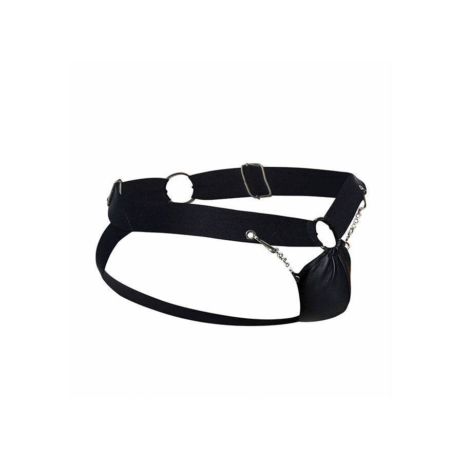 A jockstrap Chainlink é feita de couro sintético resistente na cor preta e elegante. Com cobertura mínima na parte de trás, o suor pode evaporar com mais facilidade, oferecendo um ajuste mais confortável. Uma bolsa de corrente na frente oferece suporte ao pênis sem comprometer o apelo sexual, enquanto as tiras largas se ajustam aos quadris para um acabamento de sustentação.
