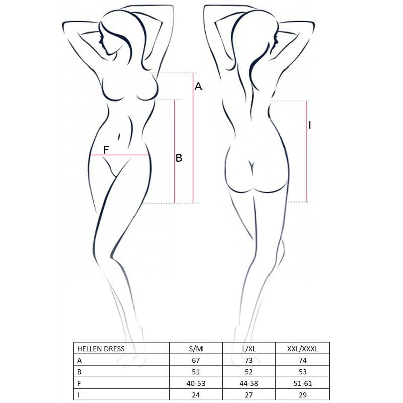 O conjunto da coleção Hellen é um fabuloso conjunto de lingerie com um design espetacularmente sexy com o qual você se tornará uma bomba de sedução, composto por um sensual vestido preto e tanga combinando, fabricado pela prestigiada marca de lingerie Passion