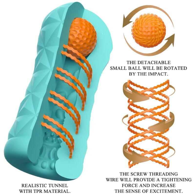 Pequena ferramenta para diversão gigantesca com masturbação! Este masturbador transparente e reutilizável possui uma espiral giratória e uma bola de estimulação na lateral, a espiral giratória faz o masturbador girar durante a penetração e a bola na parte superior pode estimular o ponto certo e dar uma nova sensação. A bainha possui em seu interior uma textura estimulante e excitante que massageia o pênis de forma intensa e dinâmica durante o trabalho manual. Você pode usar este masturbador elegante e adequado para a pele repetidamente. Muito fácil de usar e puro prazer!