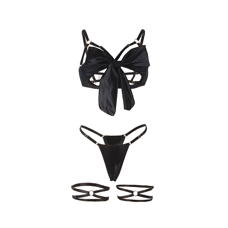 Der BH hat offene Körbchen, die die Brust zart betonen und mit einer koketten schwarzen Schleife verziert sind, die ihm eine verspielte und verführerische Note verleiht. Er besteht aus 95 % Polyester und 5 % Spandex/Elasthan und bietet eine bequeme und flexible Passform, die sich perfekt an die Kurven des Körpers anpasst und Komfort und Halt gewährleistet.
